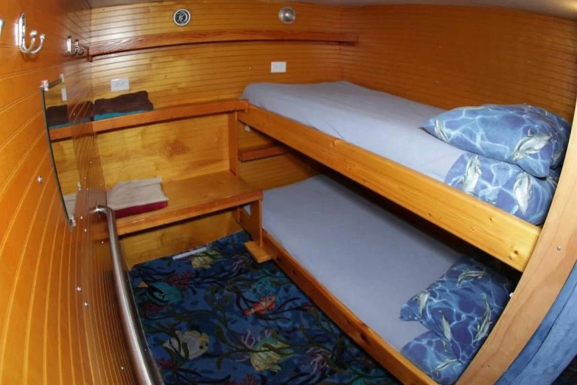 The upper deck has a dinghy (for rescues), gear storage boxes, a sundeck for sunbathing, and a covered deck to stay out of the sun with plenty of space for dolphin watching. The large bow fore deck is another great place to relax and enjoy the expansive, beautiful view of the ocean.Accommodations are simple and intentionally minimal, to keep our focus on presence, nature, and the inner work.
